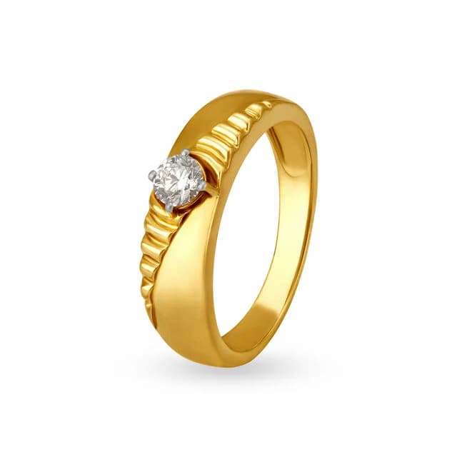 Exude timeless charm with this 18 Karat yellow gold natural Diamond Ring, featuring a luminous solitaire in a refined textured band for a distinguished, elegant touch.